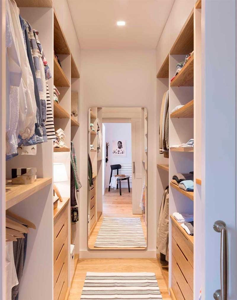 Colocar un espejo en la puerta del vestidor o cerca de él es un must que no te puedes saltar. Si no, ¿cómo vas a ver si te queda ese conjunto que tanto te gusta? Una de las opciones más escogidas es dejar libre una la pared del fondo para colgar uno.