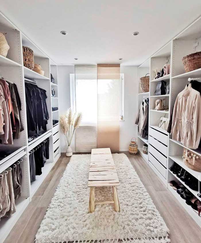 Si tienes espacio suficiente en tu hogar. ¡Aprovéchalo! Encarga un gran vestidor que inunde toda la estancia para que puedas organizar toda tu ropa y complementos a la perfección. Te recomendamos que incluyas algún banco (como en la imagen de ejemplo) para que puedas apoyar tu ropa o sentarte para ponerte los zapatos.